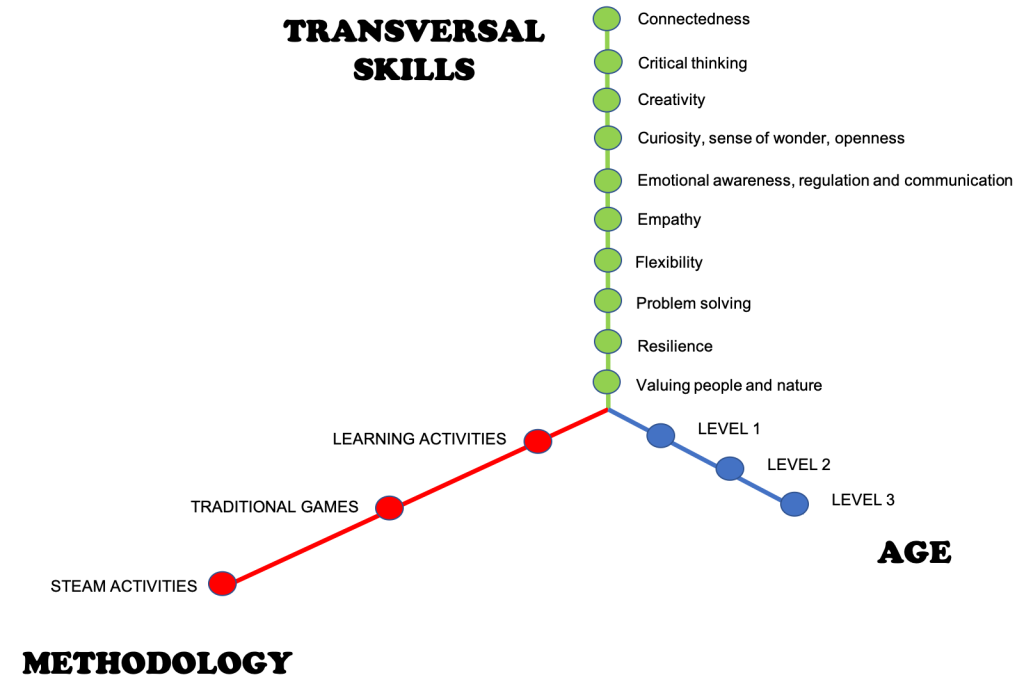 - Learning activities, including integrated and specific methodologies, traditional games, and STEAM activities (Science, Technology, Engineering, Arts, and Mathematics).