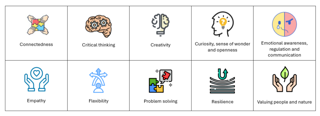 The trainer facilitates a short plenary reflection in which participants identify key pedagogical patterns. For example, participants may notice that certain skills – such as collaboration, empathy, or problem-solving – often appear in the same types of learning situations.